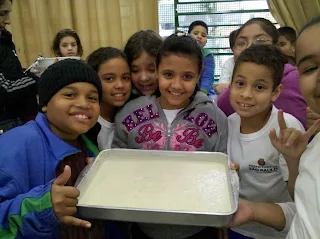 A professora Graziela fez um Bolo de Inhame com seus alunos do 4º ano C, para ilustrar uma aula de História. O livro dos alunos trazia a receita e explicava sobre os costumes do povo Africano. Diante da curiosidade das crianças a professora teve a iniciativa de realizar uma aula diferente e divertida, onde todos participaram da confecção do bolo e se deliciaram com a degustação depois de pronto. Que delícia!!!